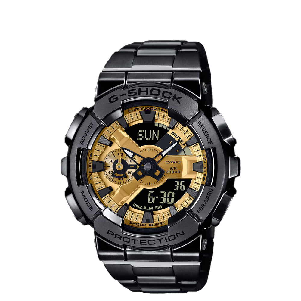 Introducing the GM-110BD, an updated take on the ever-popular large case analog-digital G-SHOCK with metal bezel and band. Precision forging, cutting, and polishing, and even special molding techniques, all go into crafting a metal bezel featuring a rugged, high-impact design, for a solid construction that sacrifices nothing in toughness. The case is made of fine resin to protect the module. With a metal band, all-black ion plating, and dial in a gold color, the GM-110BD-1A9 is up for anything — work or play.